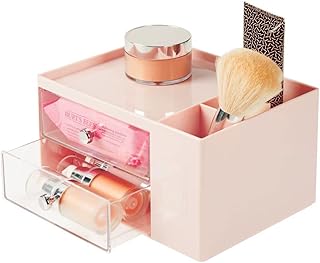 mDesign プラスチックメイクアップストレージキャディボックス バスルーム化粧台カウンタートップ用 - 引き出し2つ サイドコンパートメント2つ トップシェルフ - オーガナイザー リップグロス ブラッシュパレット ブラシ マスカラ ローションを収納 - ピンク/クリア