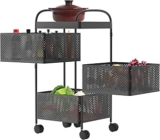 Mirahope キッチンワゴン キャスター付きワゴン キッチンラック 組み立て不要 キッチ収納 調味料ラック バスケットラック 収納ワゴン 回転可能 隙間 ワゴン トレイワゴン カート台所 洗面所 整理棚 移動式 (3段, 角形黒)